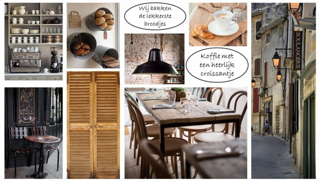 Interieurontwerp en indeling gemaakt voor een bakkerij met lunchroom in de markthal in Rotterdam. Aan de voorzijde komt de bakkerij en de verkoop van het brood assortiment. Aan de achterzijde komt de lunchroom. Er is een indeling gemaakt met voldoende werk- en verkoopruimte. Zeker zo belangrijk zijn de circa 60 zitplaatsen in de lunchroom . Het interieur van de lunchroom krijgt een Frans terras met oude steentjes en antieke straatlantaarns. Houten stoelen en bistro tafels en een paar olijfbomen in grote potten zorgen zeker voor het zuid Franse gevoel. Louvredeuren, oude luiken en grote afbeeldingen van oude straatjes op de muren maken het Franse terrasgevoel compleet. Met als resultaat dat het er genieten is van een kopje koffie met een heerlijk croissantje.