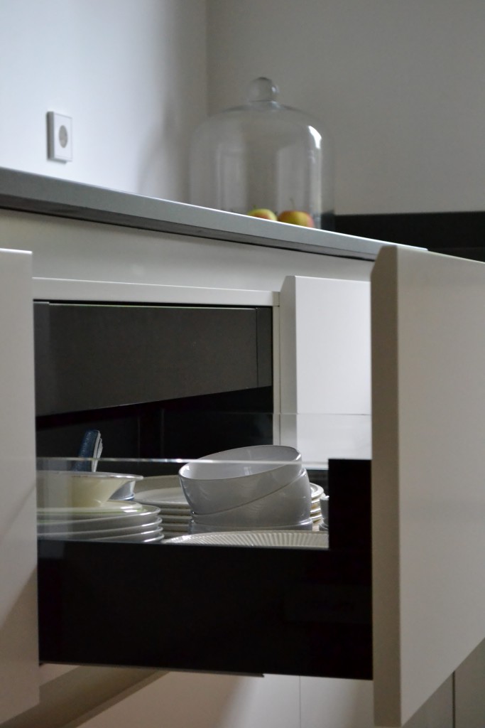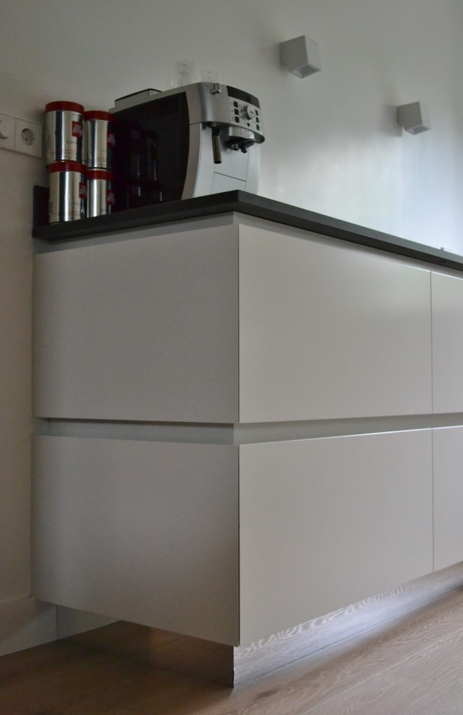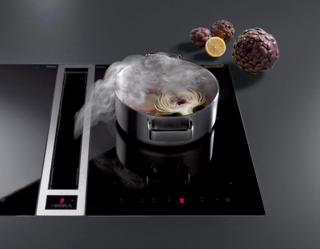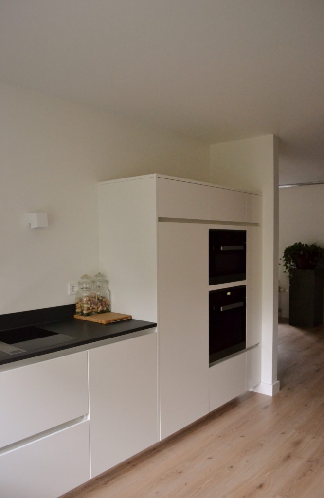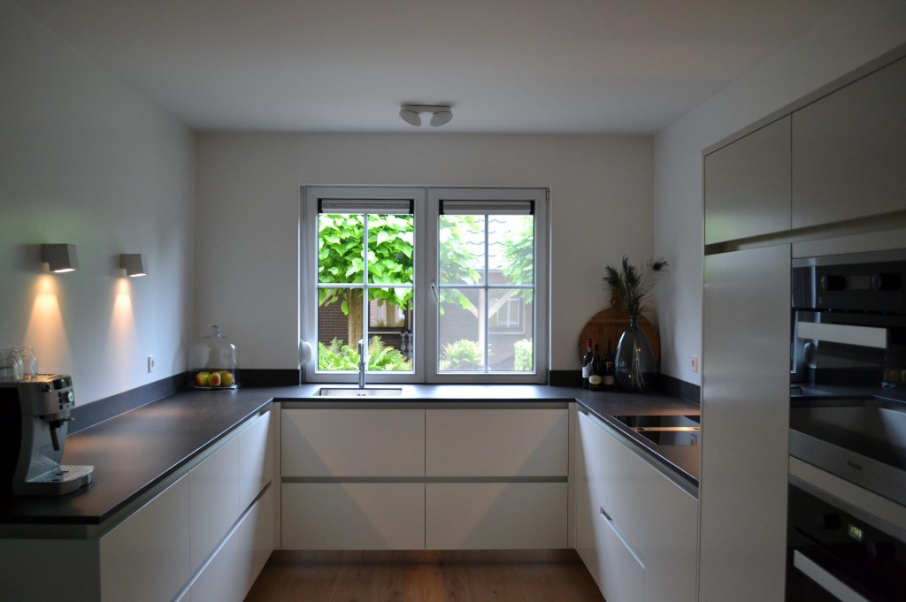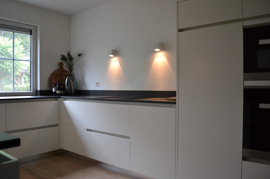 spiegelplinten Bora afzuigsysteem werkblad van keramiek kleur binnenkant zwart : ral 9011 kleur buitenkant wit : ral 9010 wandverlichting van Delta Light