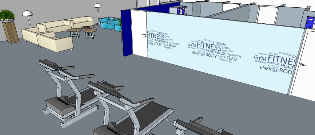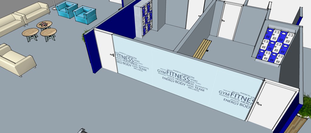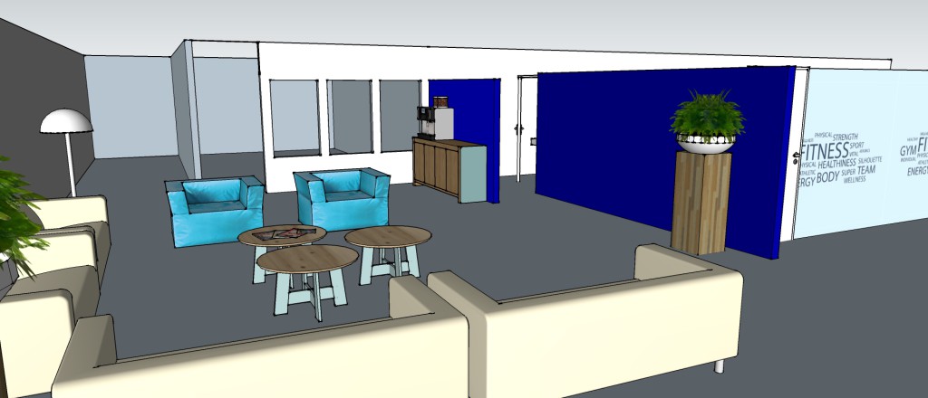 In een sportschool is een deel van de ruimte bestemd voor de kleedruimten en een zithoek.