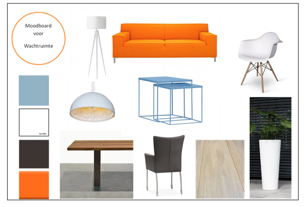 Voor een wachtruimte in de zorgsector een ontwerp gemaakt met blauw en oranje als accentkleuren.